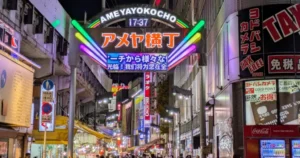Un contraste vibrante lleno de puestos de comida, comerciantes y ambiente popular que revela el pulso real de la vida en Tokio.